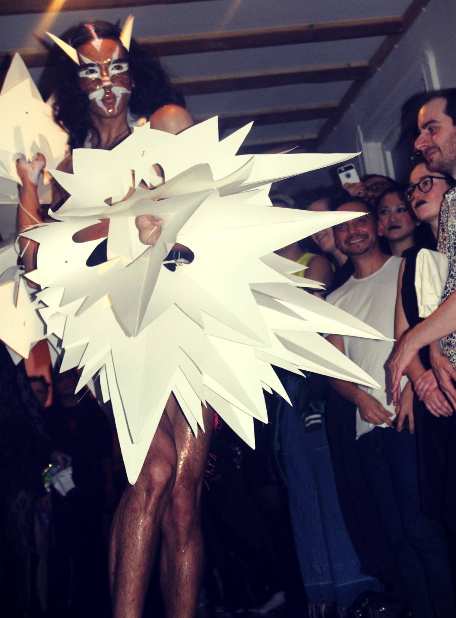 The transformable, wearable sculptures mimic the male courtship dances of birds. Although in nature it is usually a male trait to be flamboyant in western, patriarchal cultures these displays are thoroughly feminized.